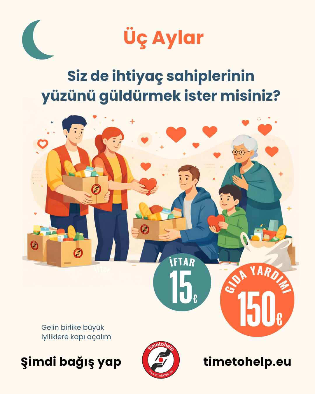 Ramazan ayı 19 Şubat 2026 Perşembe günü başlıyor. Bu mübarek ayda Time to Help olarak, dünyanın dört bir yanındaki ihtiyaç sahiplerine gıda kolileri ulaştırmak ve binlerce iftar sofrası kurmak için çalışmalarımıza başladık.